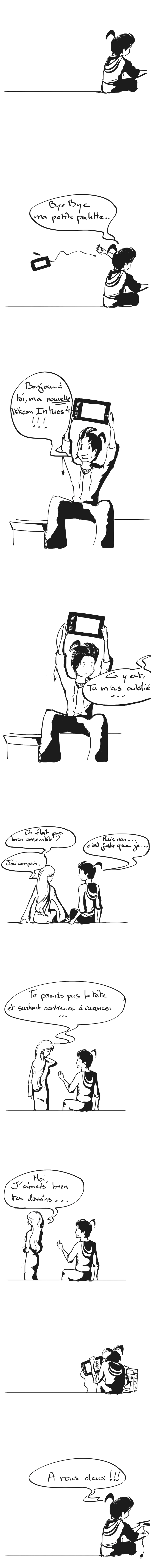Petit exercice « de style » en noir et blanc, on se rassure je ne pleure pas mon ancienne palette mais dans ces moments j’ai toujours une petite pensée pour l’objet remplacé, un peu comme de l’ingratitude. C’est bien « Lowlow » (commentateur et follower émérite de ce blog) qui m’a poussé à cet achat, ça faisait 9 mois que je bossais avec ma Wacom Bamboo Fun ,l’entrée de gamme, et je suis passé à l’Intuos 4 (si des personnes se sentent larguées par ces termes, je vous prie de rester tout de même), avec une surface active plus grande j’ai l’impression que mon poignet dévale des prairies vertes quand je dessine … Maintenant je cherche un autre remplaçant cette fois-ci pour mon logiciel The Gimp, comme l’a dit François « Le changement c’est maintenant » …
